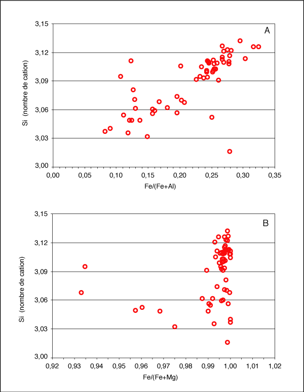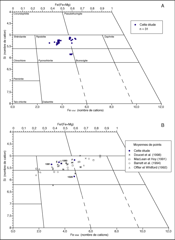Un total de 31 analyses à la microsonde électronique a été effectué sur les chlorites provenant de l'encaissant et de la minéralisation. Le résumé des résultats est présenté au tableau 4.1 et les résultats complets sont disponibles à l'annexe 4. La majorité des chlorites (figure 4.1a) sont de l'espèce ripidolite et quelques-unes de l'espèce pycnochlorite (Hey 1954). Les ripidolites sont assez pauvres en magnésium. Leur rapport Fe/(Fe+Mg) varient de 0,36 à 0,65. Les chlorites qui sont incluses dans les échantillons de sulfures massifs ont des ratios supérieurs à 0,5 et celles associées au sulfures disséminés sont sous ces valeurs. Les quelques représentants de pycnochlorite proviennent d'échantillons situés sous le gisement.