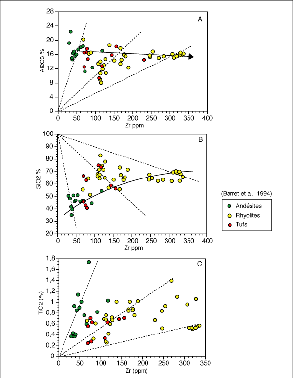L'autre indice est l'apparent gain de masse qui a affecté principalement les unités rhyolitiques. Par exemple, sur un diagramme de Al2O3 en fonction de Zr (figure 4.2a), les rhyolites montrent une déviation de la ligne de fractionnement linéaire (ligne pleine), indicateur d'un gain de masse (Barrett et al. 1993; Barrett et al. 1994). Trois lignes d'altération correspondant aux andésites et aux deux types de rhyolites sont également montrées à la figure 4.2a. Le gain de masse affecte particulièrement les rhyolites moins différenciées, alors que les autres montrent même une légère perte potentielle. Les rapports de SiO2 sur Zr abondent dans le même sens (figure 4.2b) avec les mêmes variations de masse. Le gain important en silice pour les rhyolites peu différenciées et pour les andésites est responsable de la déviation de la ligne de fractionnement visible dans le rapport Al2O3/Zr. L'alignement dans le diagramme La-Zr (figure 3.7b) indique aussi que les roches altérées n'ont pas subi de remobilisation importante des éléments du groupe des terres rares. L'existence de deux séries distinctes séparant les andésites et les rhyolites est visible sur le diagramme TiO2 versus Zr (figure 4.2c). Les rhyolites ont un rapport Zr/TiO2 d'environ 200 alors que les andésites ont un ratio de 50. Ces valeurs placent les andésites dans le champ des andésites basaltiques. Un rapport de 200 pour les rhyolites les place entre les champs des rhyolites B et des andésites. Ces rapports ne sont pas en contradiction avec les compositions qui s'étalent entre les dacites et les rhyolites pour les roches felsiques de East-Sullivan (figure 3.2a) (Winchester et Floyd 1977). Par contre, il se peut que ces deux séries de rhyolites n'en soient en fait qu'une seule mais sous l'influence de changements de masse différents.
