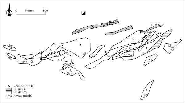 La minéralisation de East-Sullivan consiste en seize lentilles de sulfures massifs à semi-massifs cuprifères et de huit lentilles ayant une plus forte concentration en zinc (tableau 4.3). Les lentilles présentes jusqu'à une profondeur de 750 m ont un axe long vertical et des épaisseurs maximum de 75 m. La majorité des lentilles cuprifères sont généralement sub-concordantes aux unités felsiques. Les lentilles les plus importantes, soit les lentilles A, B et C (figure 4.4), sont complètement encaissées à l'intérieur d'une unité de tufs (figures 2.3 et 2.4) (Tremblay 1994). La lentille A plonge vers l'Ouest alors que les lentilles B et C plongent vers l'Est en profondeur. Les lentilles zincifères ont une distribution restreinte à la base stratigraphique du gisement et semblent recouper les unités felsiques et intermédiaires (figure 2.3). Des réseaux de veines (stockwerk) sont mentionnés (Assad 1958) mais sans description poussée. Ce dernier habitus de la minéralisation semble de moindre importance économique.