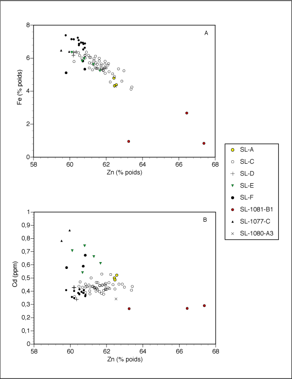 Le résumé des résultats des analyses chimiques effectuées à la microsonde électronique sur les différents grains de sphalérite est présenté au tableau 4.4 et les résultats complets à l'annexe 6. Les compositions des sphalérites (figure 4.5) varient approximativement de 59 % à près de 68 % de zinc et de 1 % à 7 % de fer. Des concentrations traces de près de 1 ppm de cadmium sont présentes dans les échantillons de sulfures massifs alors que les échantillons provenant de l'encaissant en ont la moitié moins. Le contenu en fer des sphalérites qui coexistent avec de la pyrite et de la pyrrhotite est une information importante pour identifier la température de formation des sulfures (Scott et Barnes 1971; Scott 1983). À East-Sullivan, les sphalérites à faible concentration en fer sont associées aux faciès de pyrite disséminée et de chalcopyrite-pyrrhotite (pyrite). Celles qui ont une haute teneur en fer proviennent des faciès à sphalérite-pyrite massives.