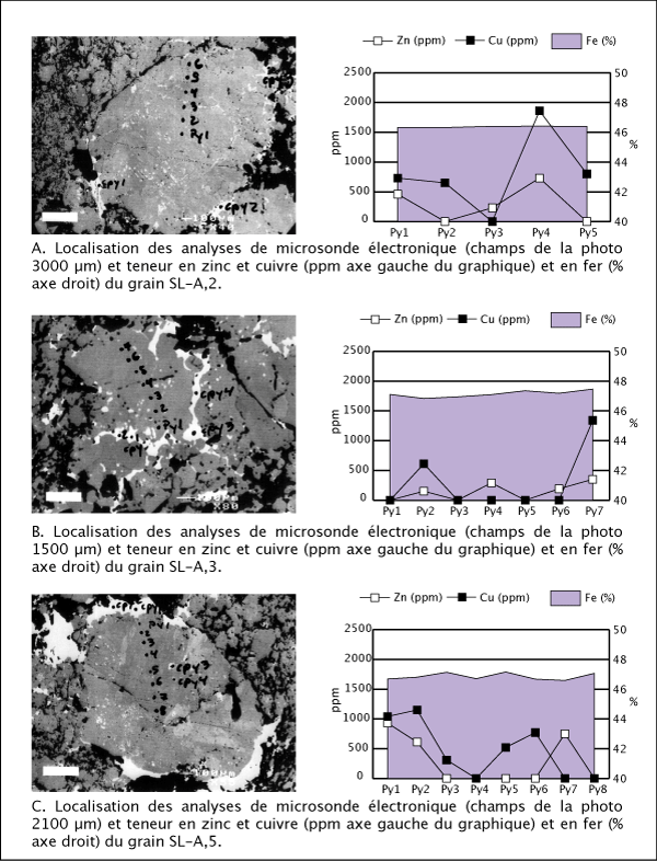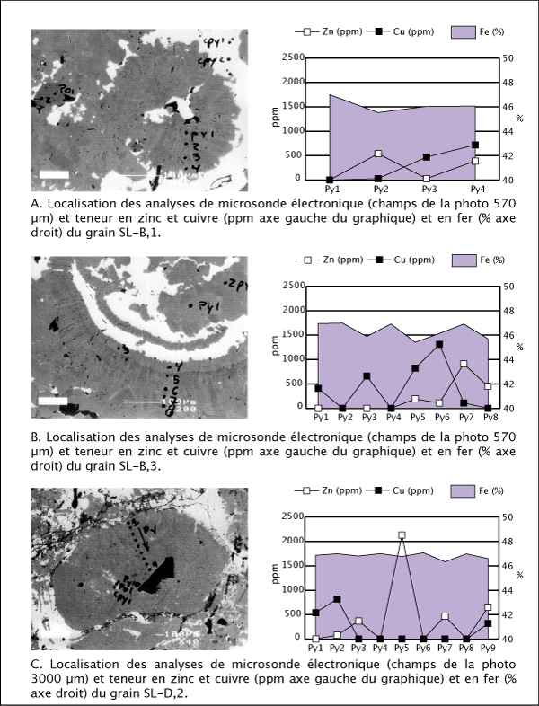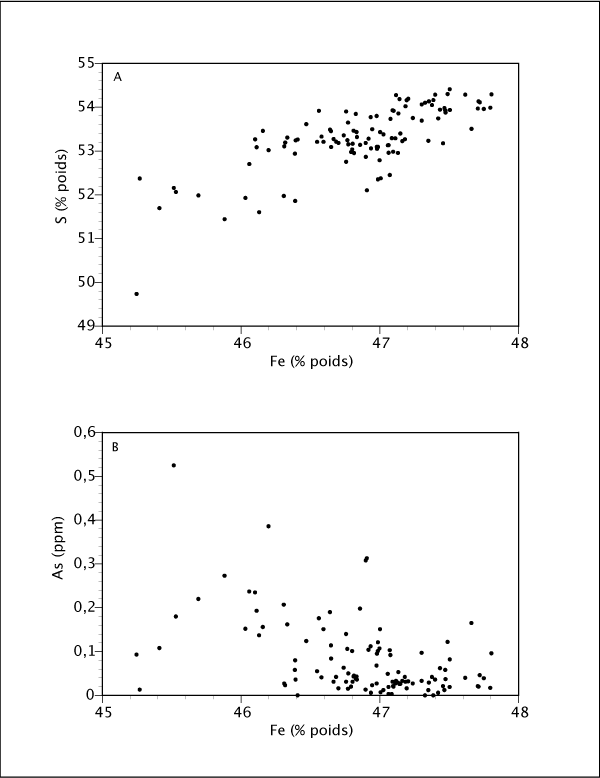 Le résumé des résultats des analyses chimiques effectuées à la microsonde électronique sur les différents grains de pyrite est présenté au tableau 4.5 et les résultats complets sont disponibles à l'annexes 7. Des traverses ont été faites sur les plus gros (300 à 2000 µm) grains à textures colloformes. Leur localisation et les résultats sont présentés aux figures 4.6 et 4.7. Les variations dans la structure interne et les faibles changements de couleur et de texture observés dans les pyrites colloformes ne semblent pas être liés à des variations chimiques. Des variations de composition importantes sont cependant visibles d'un échantillon à l'autre (figure 4.8). Les pyrites disséminées montrent une composition plus pure s'approchant de la formule idéale FeS2. Les pyrites qui sont dans les masses de sulfures massifs montrent de nombreuses impuretés dont près de 0,2 % d'arsenic (figure 4.8b). Les éléments traces les plus courants dans la pyrite sont le cuivre, le cobalt et l'or.