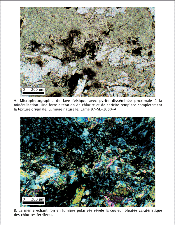 Dans les coulées felsiques massives qui présentent des sulfures disséminés, la chlorite a une biréfringence bleu, indicatrice de composition ferrifère (Thompson et Thompson 1996) et remplace avec la muscovite-séricite la majorité de la matrice cryptocristaline. Ces bancs de chlorite massive sont constitués de petits cristaux idiomorphes coalescents. La chlorite est aussi directement associée au minerai de sulfures massifs. Dans ces cas, elle forme la majorité de la gangue, dispersée en grandes plages de cristaux idiomorphes ou en amas sphéroliques et le plus souvent associée au minerai de zinc.