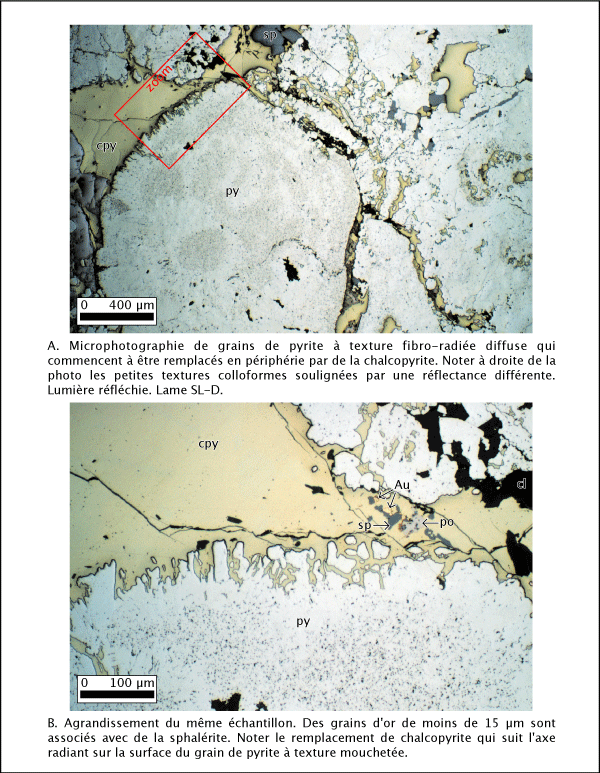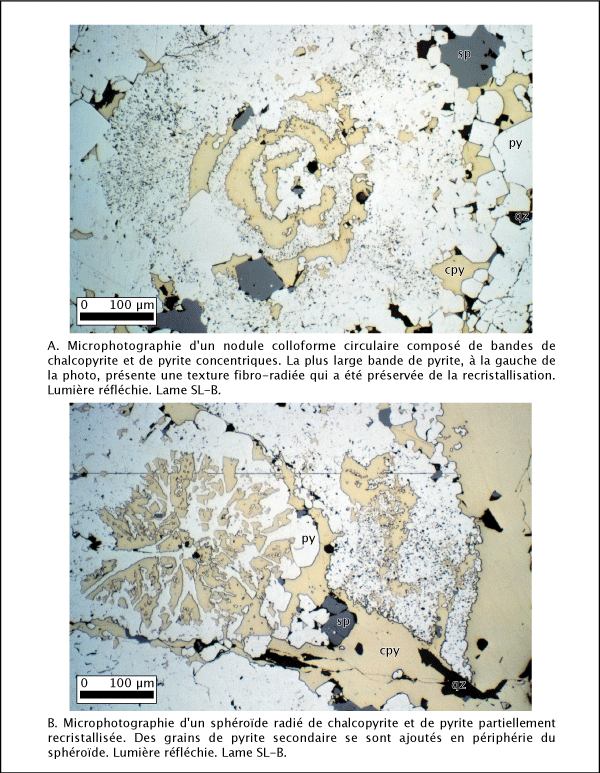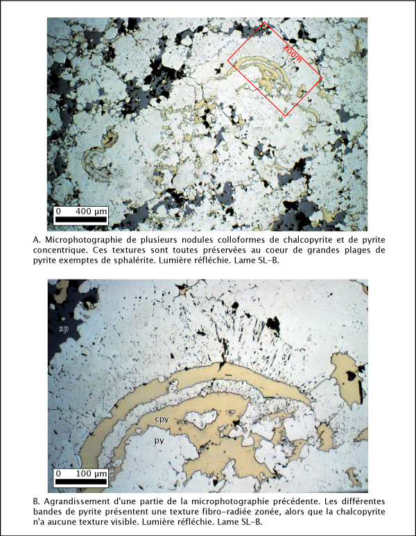 Quelques échantillons ont une meilleure préservation de leurs textures originelles précoces de nature colloïdale. Il est possible d'identifier des textures de pyrite sphéroïdales radiées (planche 4.9b) et des nodules de pyrite et de chalcopyrite colloformes concentriques (planche 4.9a et 4.10). Les textures concentriques montrent nettement une zonation texturale du centre vers l'extérieur. Des porphyroblastes de pyrite présentant une texture étoilée sont aussi présents. Les plus gros grains de pyrite sont généralement remplis de petites inclusions ou de défauts dans la cristallisation, qui sont soulignés par une variation de leur réflectance (planches 4.9 et 4.11). Ces grains plus gros qui ne sont pas encore recristallisés montrent dans leur frange des débuts de remplacement de l'extérieur vers l'intérieur le long des axes fibro-radiés (planche 4.11a).
