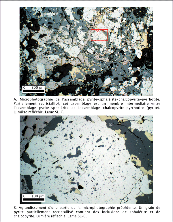 Historiquement cet assemblage de sulfures est le plus courant à la mine East-Sullivan et représente la minéralisation des lentilles principales A, C et une partie de B. Le minerai se compose d'un assemblage de chalcopyrite et de pyrrhotite (FeS) avec des traces de pyrite, de sphalérite et de magnétite et des trace d'or. Dans la plupart des échantillons récupérés, la pyrite domine en quantité la pyrrhotite. Les basses teneurs de cuivre indiquées par les rapports de la mine (tableau 1.2) laissent aussi supposer que la pyrite se devait d'être beaucoup plus abondante que ce que décrit Assad (1958). Les échantillons à chalcopyrite-pyrrhotite-pyrite qui ont été récupérés, montrent des valeurs de 50 à 70 % de pyrite, 7 à 25 % de chalcopyrite et toujours moins de 10 % de pyrrhotite. L'aspect le plus commun pour le minerai riche est un assemblage de pyrite idiomorphe dans une matrice de chalcopyrite (planche 4.9a demi droite). Cette recristallisation plus ou moins prononcée des sulfures, avec de la pyrite de forme cubique et hexagonale est caractéristique de tous les échantillons observés à la mine East-Sullivan. De nombreux grains de pyrite présentent des joints polygonaux avec des angles interfaciaux de 120°.
