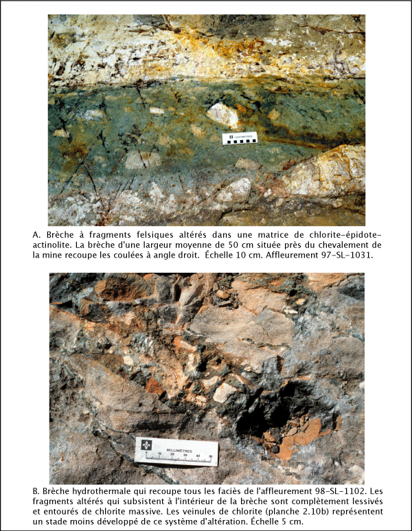 La chlorite (formule générale : (Mg,Fe2+,Fe3+,Mn,Al)12[(Si,Al)8O20](OH)16) est présente dans la majorité des échantillons sous forme de porphyroblastes de composition magnésienne à biréfringence brune (Yardley et al. 1990). Cette présence à moins de 10 % est normale pour des roches volcaniques au grade des schistes verts. Sa présence est par contre beaucoup plus importante près du gisement. Deux occurrences de petites brèches chloriteuses sont observables. La première est située aux abords de la mine; elle recoupe les laves massives; c'est une brèche à fragments anguleux (planche 4.2a) de laves felsiques lessivées blanches qui flottent dans une matrice verte. Dans cette brèche (affleurement 97-Sl-1031), la chlorite (75 %) constitue avec de l'actinolite (10 %), des carbonates (10 %) et des traces de biotite, la matrice où flottent les fragments rhyolitiques détachés de dimension centimétrique. La chlorite est en cristaux poeciloblastiques avec de nombreuses inclusions d'actinolite dispersées en forme d'aiguilles. La deuxième localisation de brèche chloriteuse est située sur l'affleurement 98-SL-1102 (figure 2.5). Sa composition et son aspect sont similaires mais de dimension beaucoup moins importante, moins de 10 cm contre près de 1 m d'épaisseur pour la première.