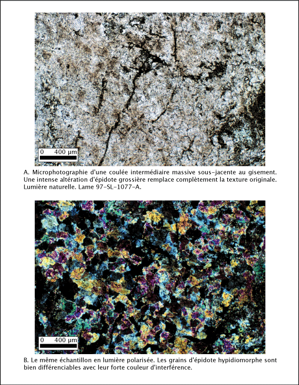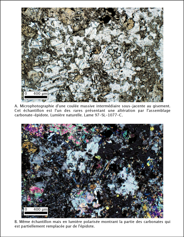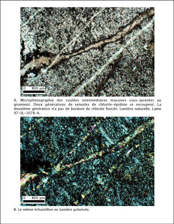 Sous le gisement, dans les coulées intermédiaires massives (ex : affleurements 97-SL-1076 et 97-SL-1077), la chlorite est présente dans des veinules millimétriques. Ces veinules noires en affleurement et qui semblent très précoces au moyen de leur recoupement ont les parois bordées de chlorite et un coeur en épidote (planche 4.3).