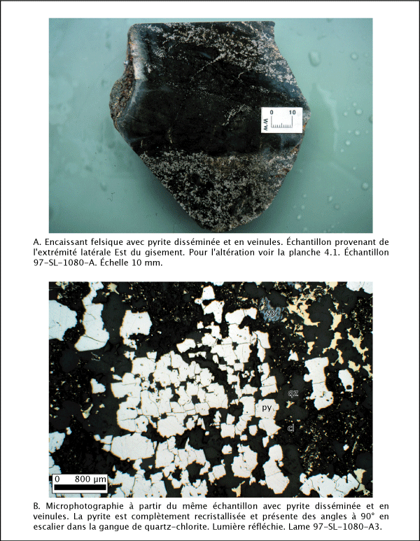 Une minéralisation en chalcopyrite (CuFeS2) et pyrite (FeS2) disséminées qui représente l'extension stérile de la minéralisation est accessible dans les rhyolites de l'éponte est du gisement (planche 4.6a). Les sulfures disséminés sont répartis de façon inégale dans une gangue de quartz-chlorite (planche 4.1). Les variétés présentes sont pyrite, chalcopyrite et sphalérite (ZnS) généralement en cristaux isolés avec peu de contact entre les différentes espèces (planche 4.6b). En lame mince, l'encaissant est altéré au point où son protolite serait impossible à identifier sans les affleurements. Les altérations dominantes sont la silicification et la chloritisation.