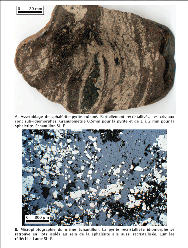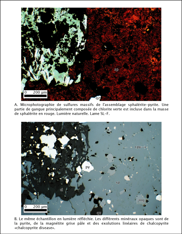 Restreint à la partie nord du gisement et généralement discordant par rapport aux unités volcaniques (figure 4.4), cet assemblage est dominant dans les lentilles E, G, W et une partie de la lentille B. Le minerai observé a généralement une texture massive et montre un rubanement de pyrite et de sphalérite en alternance (planche 4.7a). Les sulfures sont composés d'environ 50 % de sphalérite, 40 % de pyrite et des traces de chalcopyrite, pyrrhotite (FeS), magnétite (Fe2+Fe3+2O4) et galène (PbS) (planche 4.7b). La sphalérite montre de nombreux chapelets d'exsolution de chalcopyrite suivant les plans cristallins (planche 4.8). La pyrite est, la plupart du temps, en cristaux idiomorphes isolés au milieu de la sphalérite avec des joints triples à 120°. La gangue est fortement chloritisée et elle est plus abondante que dans l'assemblage chalcopyrite-pyrrhotite (pyrite) (planche 4.8).